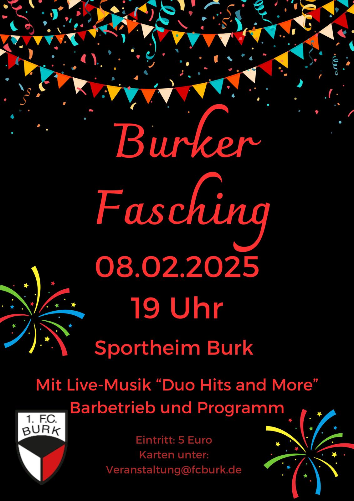 Am 08.02.2025 findet ab 19:00 Uhr unser Burker Fasching statt. Eintrittskarten können per Mail bestellt werden.