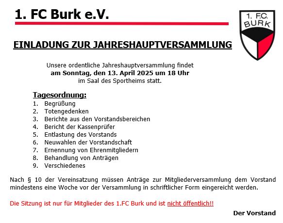 Herzlichen Einladung für alle Mitglieder zur JHV am 13.04.2025 ab 18 Uhr im Saal des Sportheims.