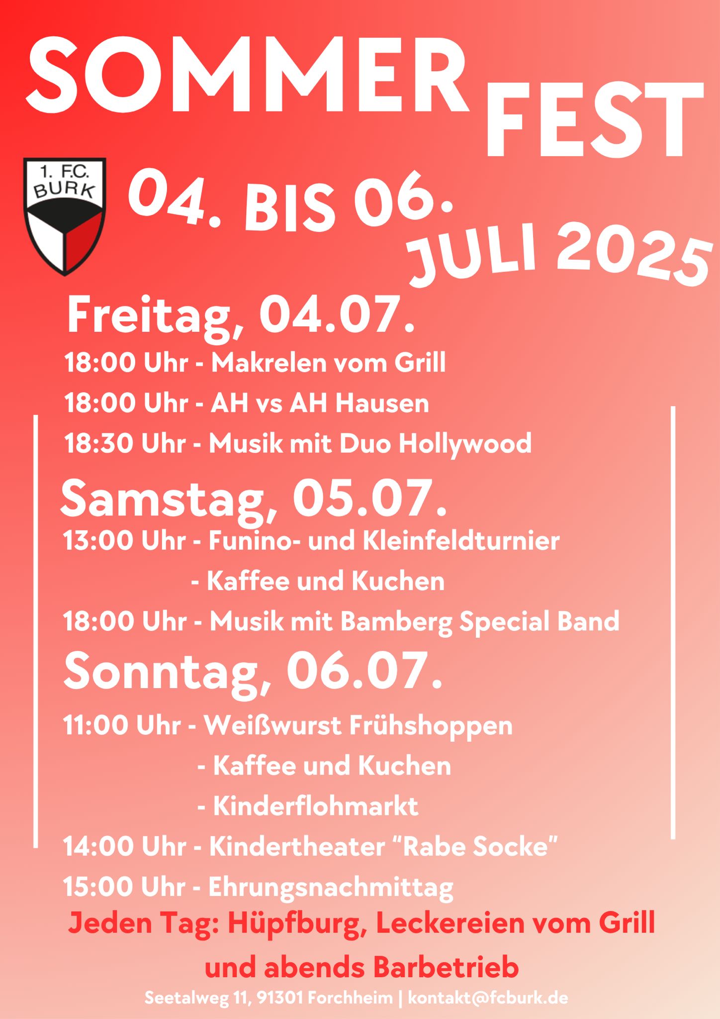In diesem Jahr findet unser Sommerfest vom 04.07.2025 bis zum 06.07.2025 am Sportheim im Burk statt.